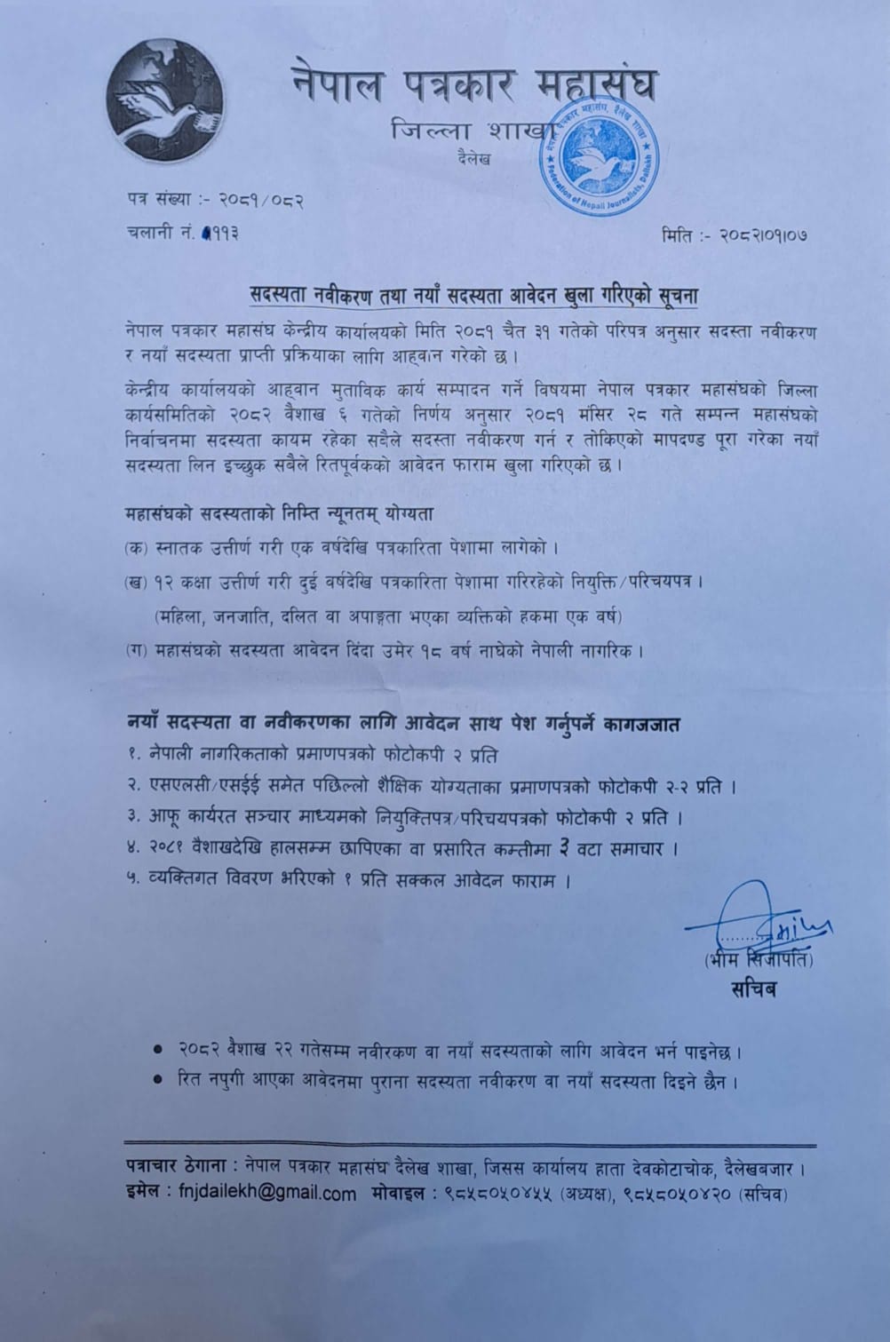 सदस्यता भर्ने म्याद थप गरिएको सूचना